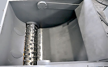 The ZBS series shredders are single shaft shredders with a tangential infeed to eliminate the need for a hydraulic feeding system. The Space saving and manoeuvrable design combined with the plug and play controls make this machine very flexible and ready to go in no time. Like its bigger brothers in the ZS series they are equipped with outboard bearings, 310 mm diameter flat E rotors with 600 or 850 mm width driven by an oversized geared motor. Utilizing the proven ZERMA knife holder and knife design. The user friendly design makes cleaning and maintenance work a breeze. The low speed of 60 rpm combined with the compact design of the ZBS shredders makes it possible to shred lumps at a relatively low noise level. The machines can be fed manually or by conveyor, material discharge can be done via conveyor or into a drop box.